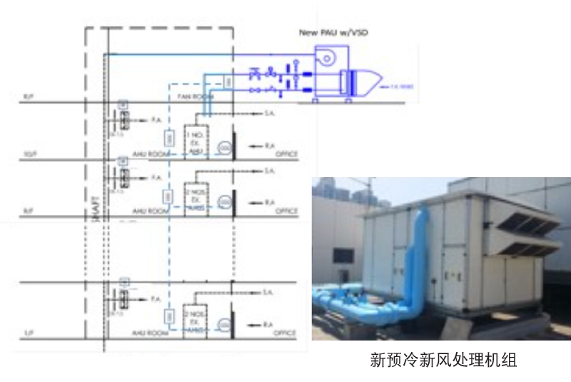 - 办公室、呼叫中心和食堂的空气处理机组和风机盘管机组,采用预处理后的新风。