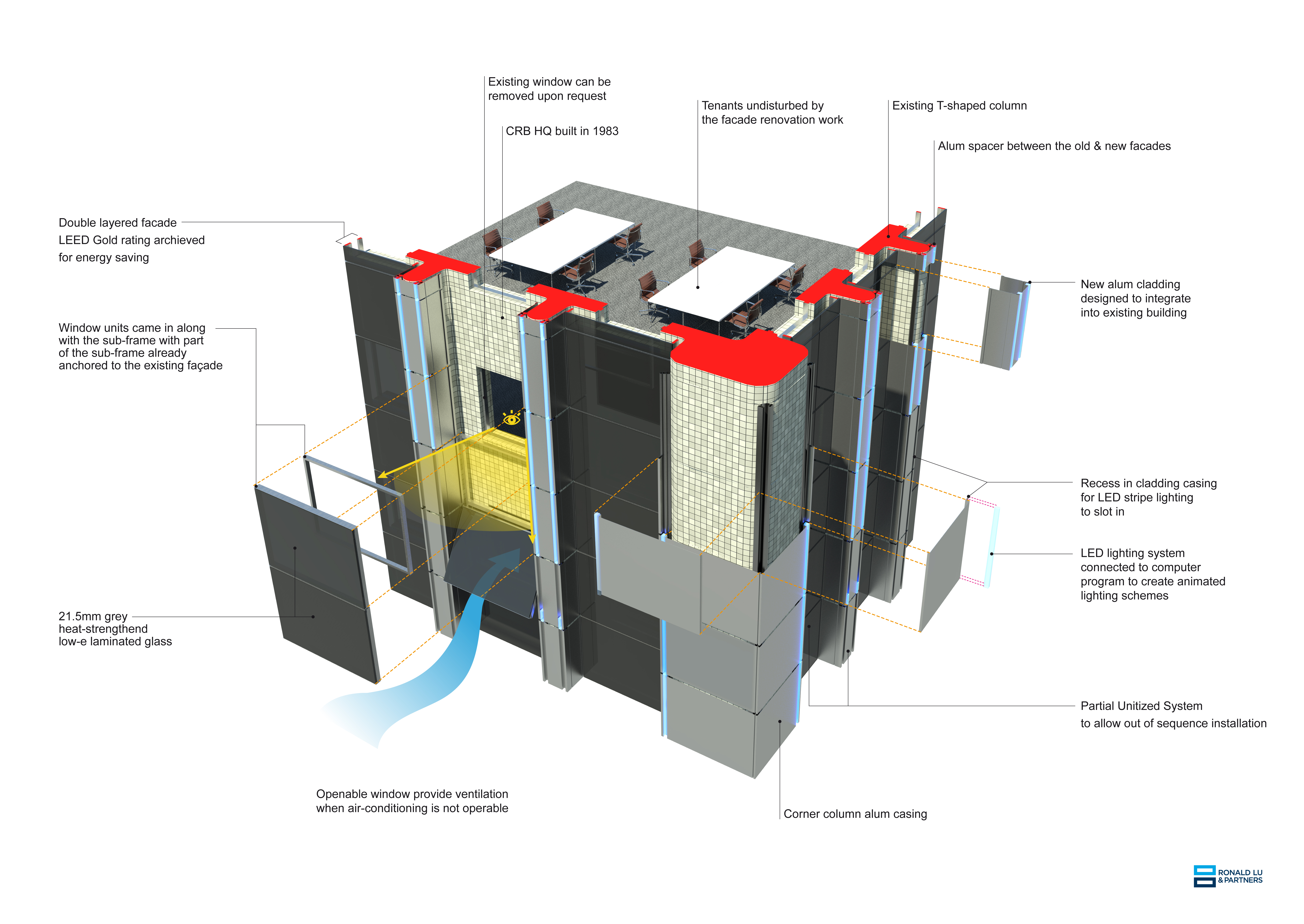 - 对现有的白色瓷砖和红色石材外墙进行了改造,增加了新的幕墙,采用了玻璃面板、铝和不锈钢外墙等坚固的建筑材料,便于日后维护。